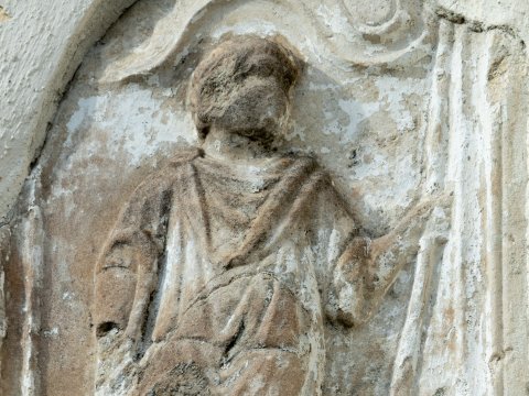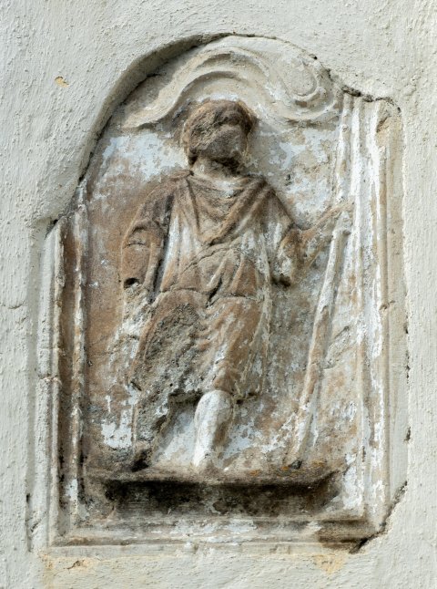 - Diener (Librarius - Scriba, Kurier): in Bogennische auf flachem Podest Mann in kurzer Tunica und Sagum, in der Rechten Polyptychon (?), in der Linken langer Stab.