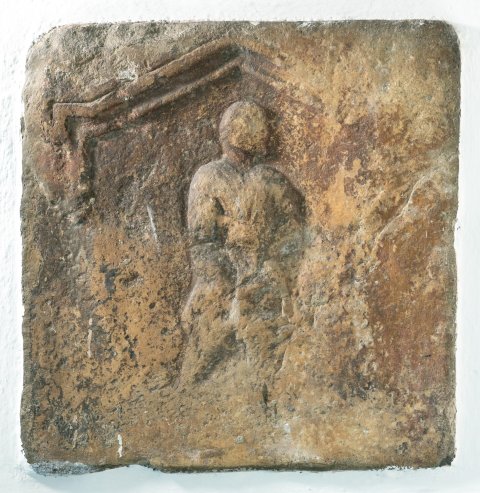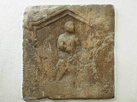 - Diener (Librarius - Scriba ?): in Bildfeld mit Giebel Mann in kurzer Tunica.