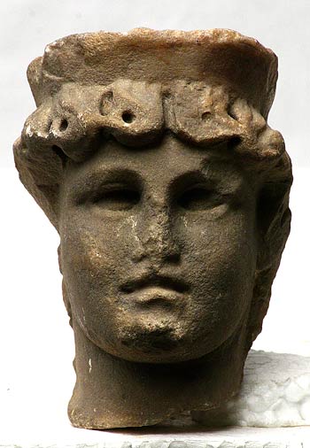 - Mythische Figur (Göttin): Weiblicher Idealkopf mit Stirnlocken und Diadem. Augen waren eingelegt.