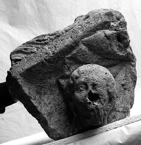 - Fragment eines offenen Giebels mit Muschelnische, darin Kopf einer Frau. Auf der Giebelschräge Rest von Akanthusfries.
