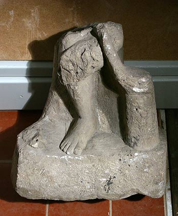 - Mythische Figur (Cautopates) oder Trauergenius (?): auf vorspringendem Sockel Reste der nackten gekreuzten Beine einer Figur mit gesenkter Fackel.