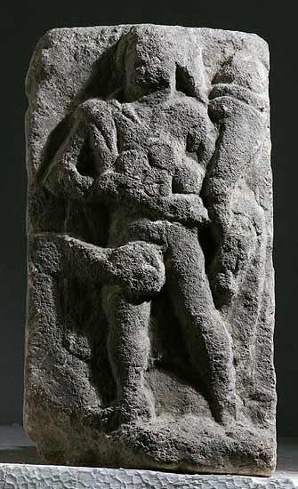 - Mythische Figur : rahmenlose Platte mit vorspringender Standleiste. Priapus in Schrittstellung, Mantel um Schultern und linken Arm. In der Linken Füllhorn, die Rechte hält Mantelbausch mit Früchten.