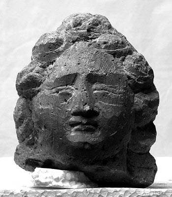 - Mythische Figur (?): Kinderkopf mit geschlossenen Augen und langen Locken mit Scheitelknoten. Teil einer Geniusstatuette von einem Grabmal ?
