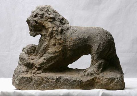- Auf flacher Sockelplatte stehender Löwe, Vorderpranke auf Beutetier.