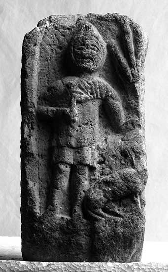 - Mythische Figur : einfach gerahmte Platte mit Standleiste. Frontal stehender Silvanus in kurzer Tunica, Mantel und phrygischer Mütze, in der Rechten Winzermesser, in der Linken Zweig. Neben dem linken Fuß sitzender Hund.