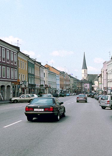 Der langgestreckte Marktplatz mit Stadttor am Südende wurde erst im 13. Jh. an der Straße von Salzburg nach Braunau angelegt. Schon im 7. Jh. entstand an der Stelle der heutigen klassizistischen Kirche und des Schlosses eine Pfalz der bairischen Herzöge, die dann zu einem karolingischen Königshof wurde. Aber schon 1007, als der Platz als kaiserliche Schenkung an Bamberg fiel, war es mit der überregionalen Rolle Mattighofens wieder vorbei. Der Reliefblock von einem römischen Grabbau, der jetzt in der Einfahrt des Schlosses steht, wurde bei der Pfarrkirche gefunden.