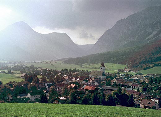 Der Ort liegt über dem Ennstal auf einem weiten Hochplateau vor den Kalkwänden von Kammspitz und Stoderzinken ( Mautstraße für Faule bis unter den Gipfel). Die stattliche spätgotische Kirche besucht man vor allem wegen des schönen Flügelaltars, der heute an der Seite des Chores steht, ursprünglich aber - als Altar für die Laien - den Chor vom Kirchenschiff trennte. In der Seitenkapelle stand früher auch ein römischer Grabaltar, der in einem Seitenaltar verbaut gewesen war. Heute wird er im Ortsmuseum aufbewahrt.