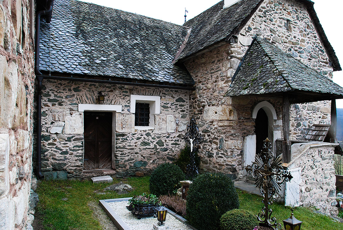Das Plateau auf dem steil abfallenden Felsen, am Fuße des Ulrichsberges und mit Aussicht auf die Kirche von Maria Saal, ist ein besonders geschichtsträchtiger Ort. Er war schon in der Hallstattzeit besiedelt, doch seine größte Bedeutung erreichte er im 9. Jh., als hier eine karolingische Pfalz stand, in Urkunden curtis carantana genannt und 888 von König Arnulf besucht. Die heutige Kirche war die Kapelle dieses befestigten Königshofes und ist eine der ältesten Kirchen Kärntens.