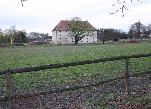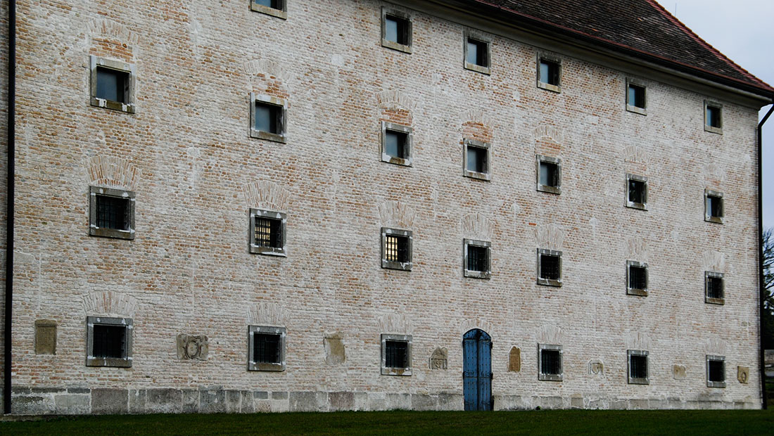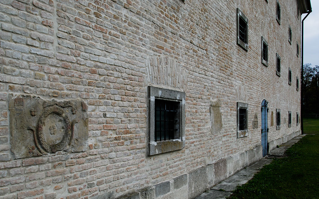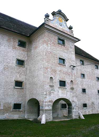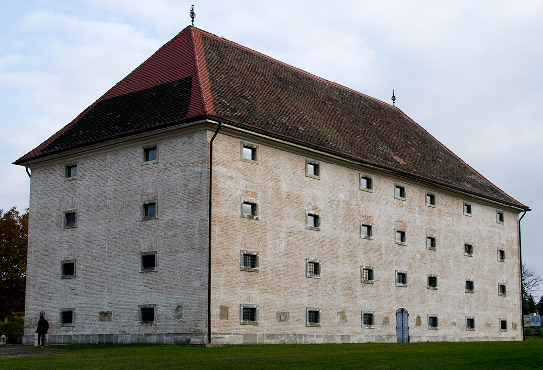 Auf dem Gelände der Zivilstadt von Carnuntum, das sich westlich des konservierten Ruinenfeldes im Schlosspark erstreckt, erhebt sich imposant in seiner verwitterten Massigkeit der Schüttkasten (Getreidespeicher) des Schlosses Traun. Über der Einfahrt, die durch einen Vorbau mit vasenbekröntem Giebel führt ist eine schlichte, vielfach gesprungene Bauinschrift eingelassen, die ausführlich auf den geschichtsträchtigen Boden Bezug nimmt, auf dem das Gebäude im späten 18. Jh. errichtet wurde. Zum Beleg sind etliche Bruchstücke römischer Grabstelen in das Ziegelmauerwerk eingelassen.