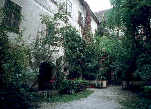 Hügelzug begrenzt, auf dessen Kamm versteckt im Wald das Schloss Freiberg steht. Im 12. Jh. saßen hier Dienstmannen der Herren von Stubenberg, das jetzt bestehende Gebäude mit Arkaden-Innenhof und romantischer Gartenterrasse an der Westseite bauten die Grafen Kollonitsch im 17. und 18. Jh. Der Anschein malerischen Verfalls trügt hier, denn das Schloss beherbergt einen erfolgreichen Gastronomiebetrieb mit Zusatzangeboten kultureller und folkloristischer Art. Der Innenhof würde allerdings eine Entrümpelung vertragen, schon aus Pietät für die dort eingemauerte römische Grabstele, die laut zugefügter Inschrift 1658 in der Nähe ausgegraben wurde. Bei dieser Gelegenheit ist auch die Grabinschrift aufgefrischt worden.