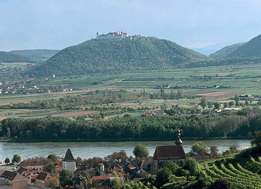 Das entrückt auf seinem Hügel thronende Stift erscheint dem Besucher monumental genug, dabei ist es ein nur halb ausgeführtes Projekt. Der gesamte Berg hätte im 18. Jh. mit gewaltigen Substruktionsbauten und Bastionen architektonisch geformt werden sollen, doch haben Initiative und Mittel nur für Ost- und Nordtrakt des Stiftes ausgereicht. Die im Zentrum stehende Kirche mit ihrer Doppelturmfassade ist im Inneren ein geglücktes Zusammenspiel von spätgotischen Chor und barockem Kirchenschiff. In der Krypta wurde dem Klostergründer von 1074, Bischof Altmann von Passau, um 1540 ein Grabmal errichtet. Im Stift überwältigt die lichtdurchflutete Kaiserstiege mit ihren Deckenfresko von Paul Troger. Dort stehen in einem Winkel zwischen den Treppen auch zwei römische Inschriftsteine, vermutlich aus dem am Donauufer nördlich von Göttweig gelegenen römischen Kastell Favianis (Mautern).
