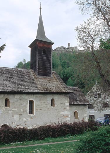 Zu Füßen der das Villacher Becken beherrschenden Festung Landskron und von deren Brüstungsmauer aus spielzeughaft anmutend steht das Kirchlein von Gratschach, im 12. Jh. als Eigenkirche des nahen Klosters Ossiach errichtet. In den Mauern des bescheidenen Baus sind zahlreiche marmorne Römersteine sichtbar, die wohl von einem in der Nähe gelegenen Grabbezirk stammen.