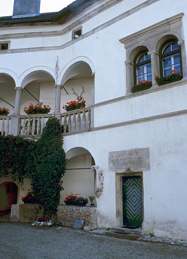 Über der Brücke, die südlich von Klagenfurt die Drau überquert, ragt auf dem Nordufer des Flusses eine fast senkrechte Felswand auf, auf der das Schloss Hollenburg thront. Die seit dem frühen Mittelalter dort bestehende Burg wurde im 16. und 17. Jh. zur heutigen Form ausgebaut. Von außen schmucklos bis auf die mit einer Scheinfassade bemalte Eingangsfront, wo Landsknechte aus Fenstern drohen, öffnet sich nach dem langen Gang über den Wehrgraben ein südlich anmutender Hof mit Laubengängen, moralisierenden Sprüchen über den Türen und eingemauerten Römersteinen. Die Innenräume sind nicht zugänglich, doch kann man vom Hof aus auf den schmalen Söller treten, wo man über das Rosental zu den Karawanken schaut.