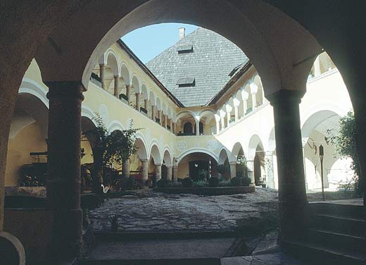Schloss Halleg, das nordwestlich von Klagenfurt auf einer bewaldeten Kuppe steht, verbirgt hinter seinem abweisend burgartigen Äußeren einen stimmungsvollen Arkadenhof aus dem späten 16. Jh. Im davor gelegenen Eingangshof ist das Relief eines Dieners von einem römischen Grabbau eingemauert. Das Schloss selbst ist nicht zu besichtigen, der kleine Garten auf der Südseite ist aber gastronomisch erschlossen.