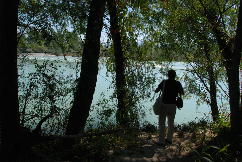 Der Weg neben der Kirche führt zum Fluss, wo man bei Niederwasser noch die Reste des Brückenkopfes sehen kann.