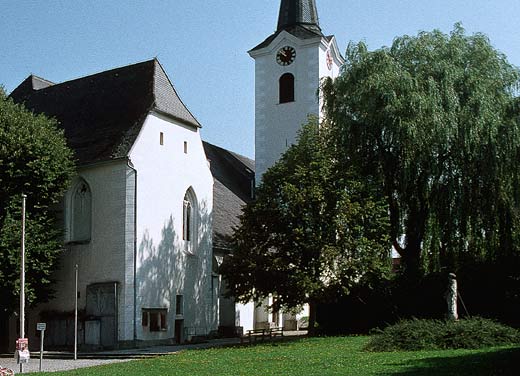 Die Kirche liegt etwas abseits und erhöht oberhalb des lang gezogenen rechteckigen Hauptplatzes, der anlässlich der Erhebung des Ortes zum Markt angelegt wurde. Die romanische Kirche wurde im 15. spätgotisch ausgebaut. An der nördlichen Außenwand sind neben frühneuzeitlichen Grabsteinen auch drei römische Stelen eingemauert, darunter die einer Familie von Honoratioren der römischen Bezirkshauptstadt Aelium Cetium (St. Pölten).