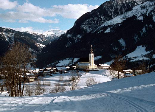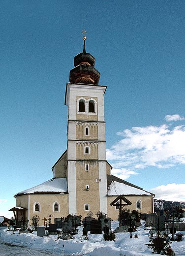 Auf einer Kuppe am Westrand des Ortes liegt erhöht über dem Marktplatz die gotische Kirche mit dem im 18. Jh. aufgestockten Westturm. Eine Pfarrkirche ist an diesem Platz seit dem 11.Jh. bezeugt, nach einem Brand im Jahr 1334 wurden die Reste der romanischen Kirche umgebaut und zur heutigen vierschiffigen Basilika erweitert. Im Inneren sind noch Reste gotischer Fresken zu sehen. Blickt man vom Friedhof zum Turm hinauf, erkennt man rechts oberhalb des 2. Fensters ein römisches Grabrelief mit den Köpfen eines Ehepaares.